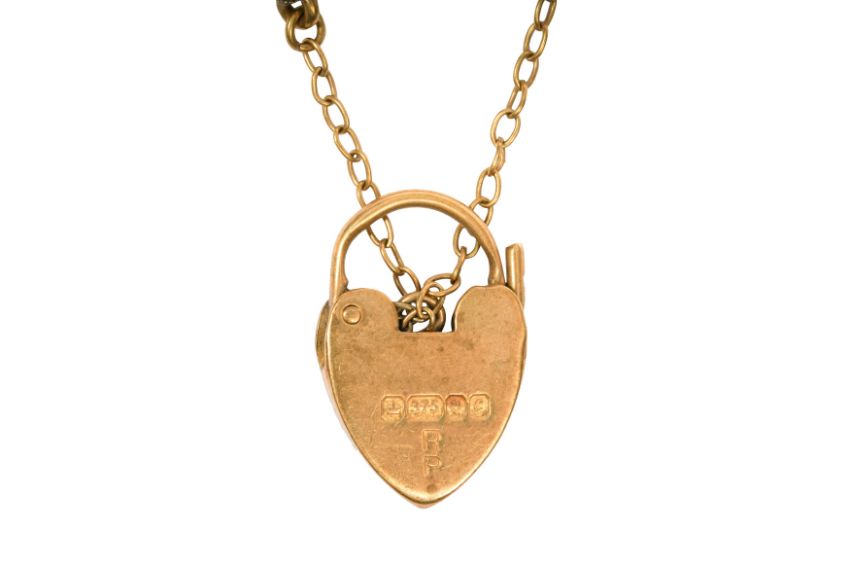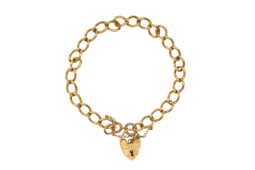 A 9CT YELLOW GOLD HEART-LOCK GATE BRACELET, CIRCA 1977, Of a polish finish, on a curb-chain link design, with safety cable-chain, maker's mark, UK hallmark, length 20.8cm, total gross weight approx. 13.7 grams