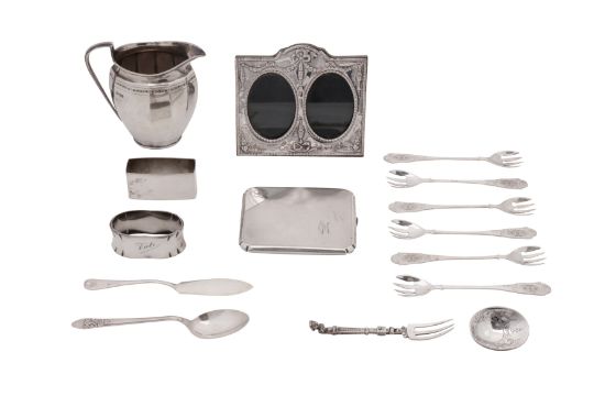 Rectangular form, engraved. Together with a sterling milk jug, German 835 napkin rings, reproduction Dutch folding combination spoon and fork, others. (Q)