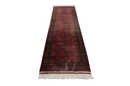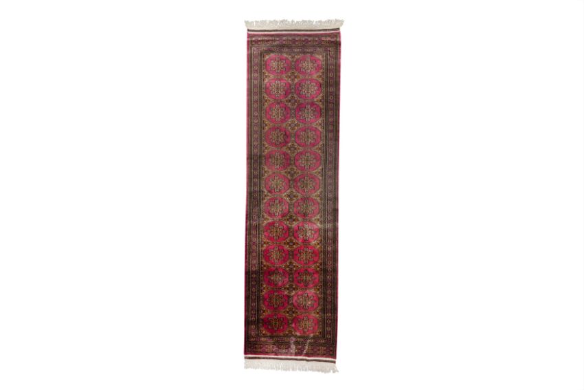 Approx: 310cm. x 82cm. Very nice overall design and well balanced colours. This runner has full pile, very soft wool quality, Ends with original kilim and fringes. Selvages are also original. In general, this runner is in very good condition. Elegant and good furnishing size.