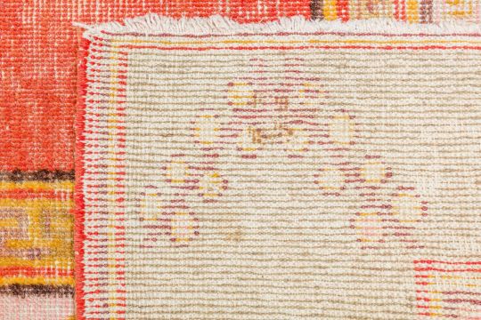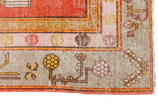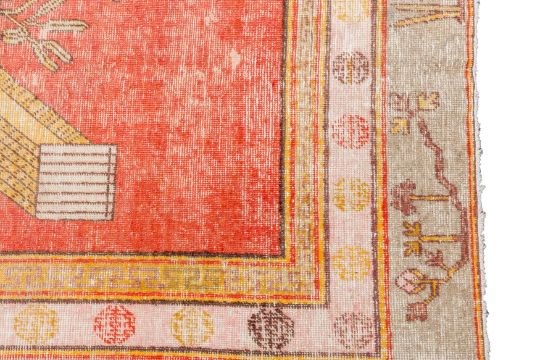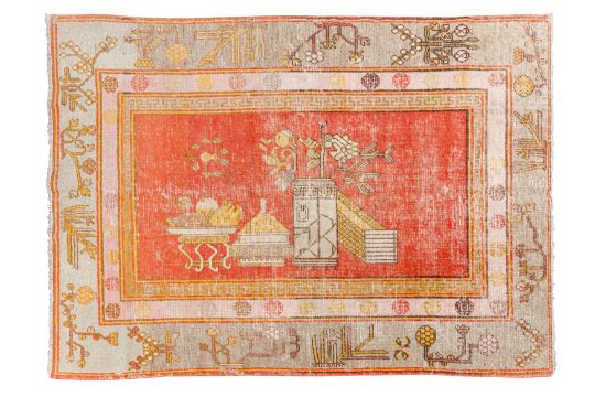 Approx: 137cm. x 194cm. Classic for this type with nicely drawn design of stylised flowering vases. Colours anre well balanced. This rug has wear to the pile,down to knot collar and below in places. Selvages original with touches of rebound on cord. Scattered very small old repairs on edges. Ends with short fringes, secured. In generral this rug is in fair usable condition. Popular type on the market.