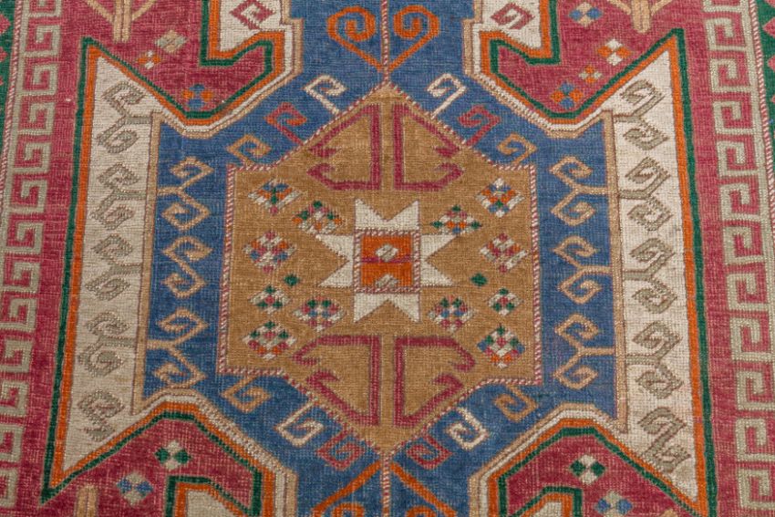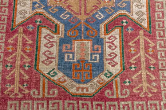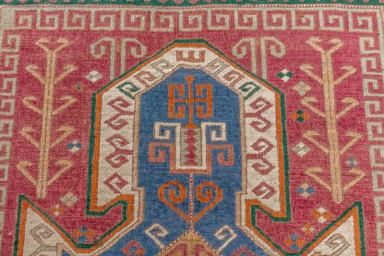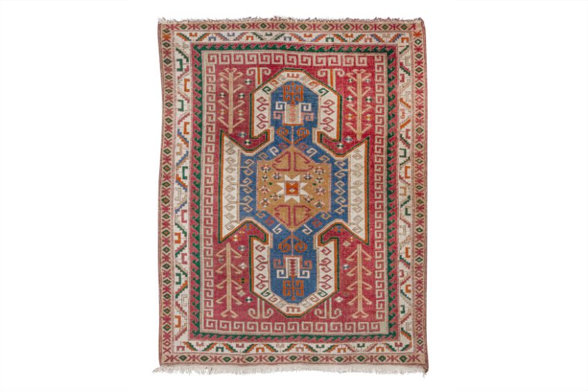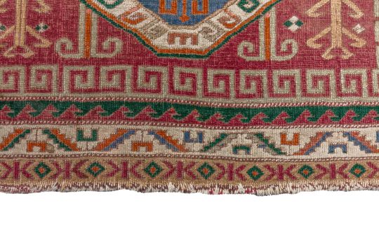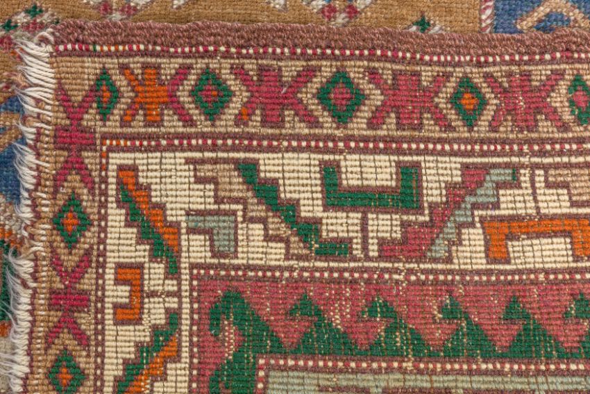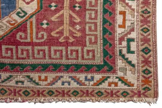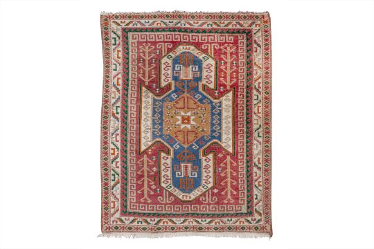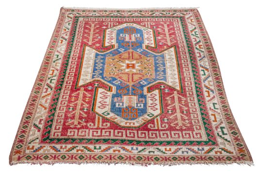 Approx: 178cm. x 138cm. Classic design with large multicoloured shield medallion flanked by hooked trees and inner hooked running-dog frame. This rug has slight wear to the pile, down to knot collar and below in places. Slightly corroded brown. One end original with kilim and fringes. Second end slightly fraying. Selvages secured. In general this rug is in good usable condition. Attractive and veery good furnishing piece.