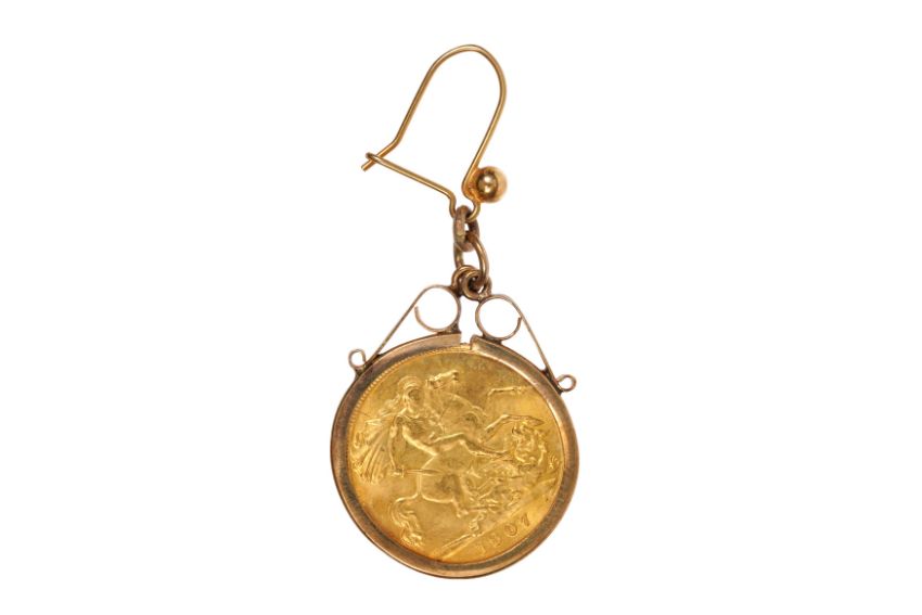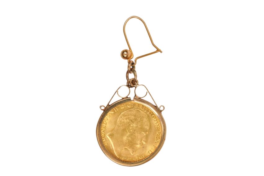A HALF SOVEREIGN COIN PENDANT, A 22ct gold King Edward VII half sovereign coin, dated 1907, to a 9ct yellow gold fixed foliage mount, circa 1974, suspended from an earring fitting, mount with maker's mark and UK hallmark, total gross weight 5.5 grams