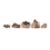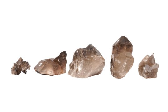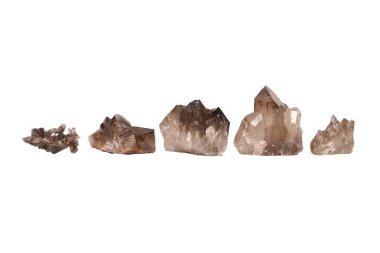 A GROUP OF FIVE SMOKY QUARTZ CLUSTERS, each featuring well-formed, translucent to deep brown crystals with a natural lustrous finish.