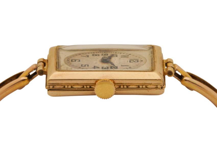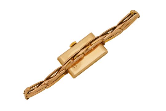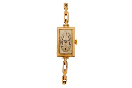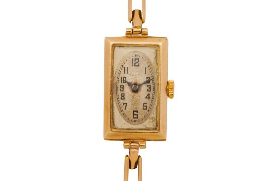 ROLEX A VINTAGE LADIES 9CT YELLOW GOLD WATCH, winding signed movement, signed silvered dial, black Arabic numerals, black outer minute division, blued leaf hands, signed case, engraved on the reverse 'Rolex 25 world's records, Geneva - Suisse', expandable bar-link bracelet, maker's mark in the inner case and on the bracelet, UK hallmark in the inner case, bracelet stamped 9ct, case sizes 24 x 14mm, bracelet inner diameter approximately 5.5cm