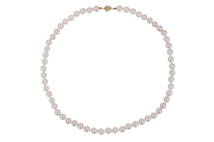 AN PEARL IMITATION NECKLACE, Composed of a single stran af round pearl imitations, to a ball-shaped textured clasp, stamped Au585, length 47.0cm, weight 29.4 grams