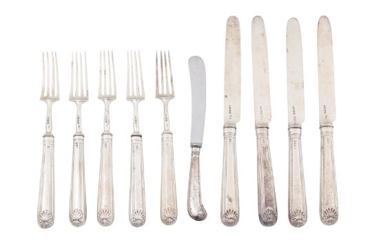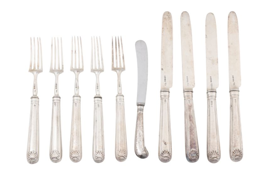 Comprising five fruit forks and four fruit knives. Shell terminal. (9)