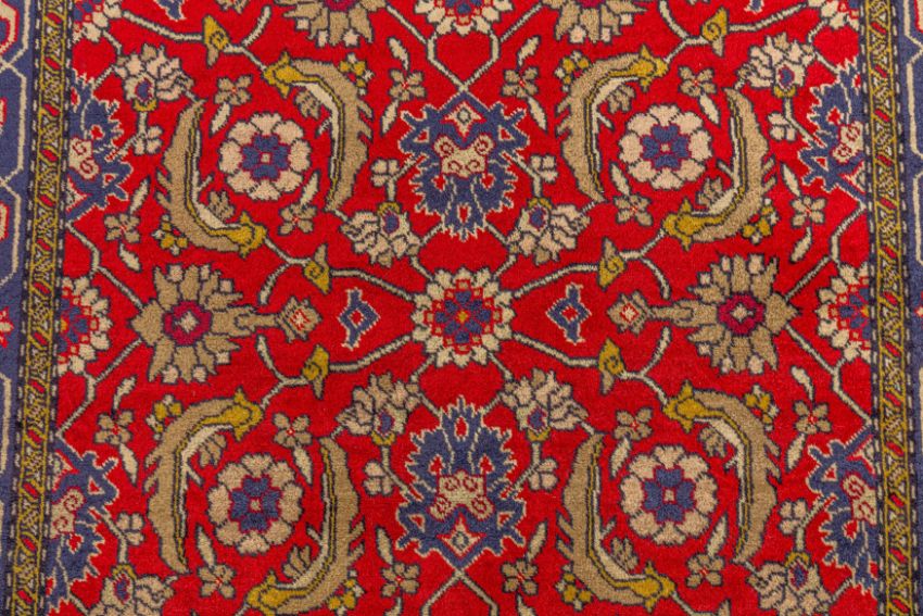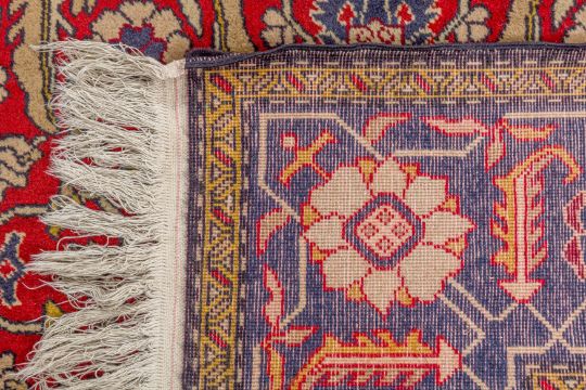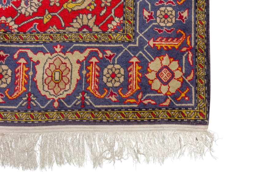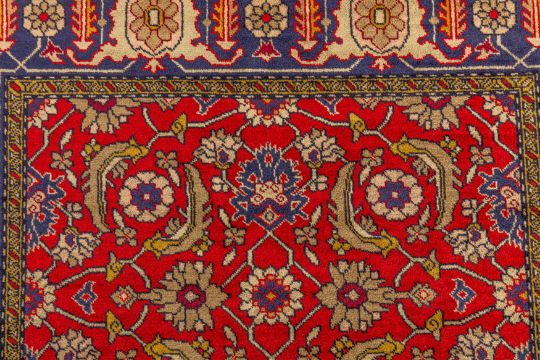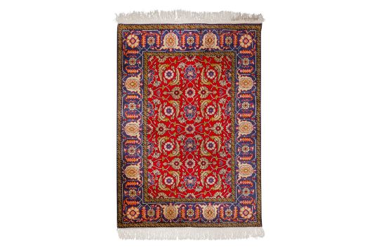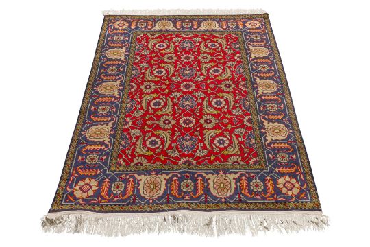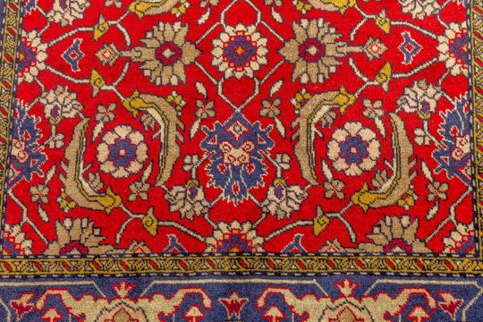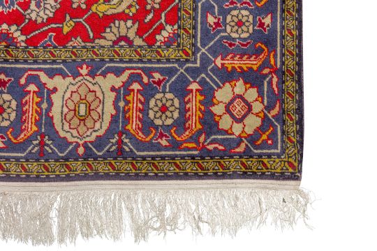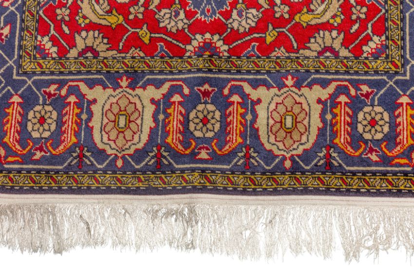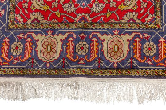 Approx: 154cm. x 109cm. Great overall design with very nicely balanced colours. All surrounded by broad palmette and hooked leaf vine border. This rug has full pile, soft wool quality. Selvages original. Ends with original kilim and fringes. In general, this rug is in very good condition. Attractive and very good furnishing piece.