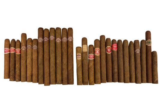 A DUNHILL HUMIDOR CONTAINING TWENTY-FIVE CUBAN CIGARS, a well-crafted Dunhill wooden humidor, complete with key, featuring cedar lining and a humidifier, containing twenty-five cigars, some unbanded, mostly Cuban, including Montecristo, Romeo y Julieta, and Partagas, along with one Jamaican cigar noted for its excellent aroma.