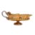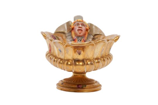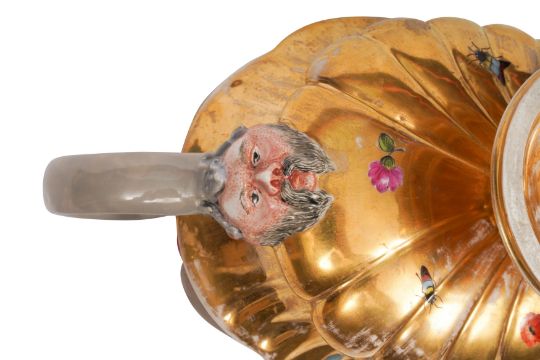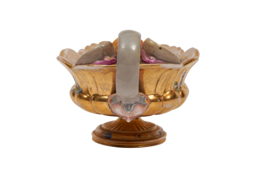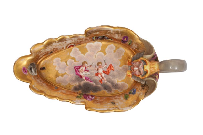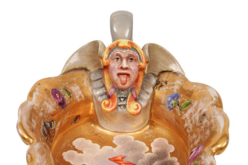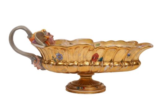 A 19TH CENTURY CONTINENTAL PORCELAIN SAUCE BOAT, featuring a mask design at the handle, with hand-painted floral and insect motifs, including detailed butterflies and flowers in rich hues, the interior further adorned with an intricate cherub scene set amongst clouds, resting on a scalloped pedestal base.