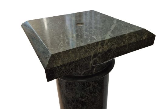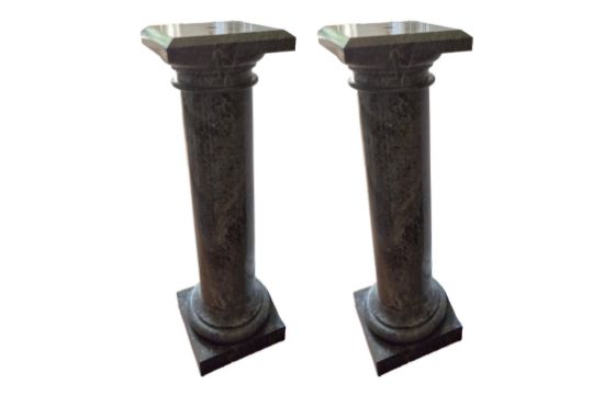 A PAIR OF GREEN MARBLE COLUMNS, each featuring a cylindrical pedestal with a square base and top, the polished surfaces highlighting the natural veining of the stone.