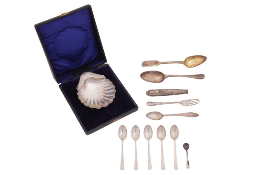 Fiddle pattern, engraved. Together with another dessert spoon, probably Danish, maker’s mark CS. Assorted over flatware and a butter shell. (Q)
