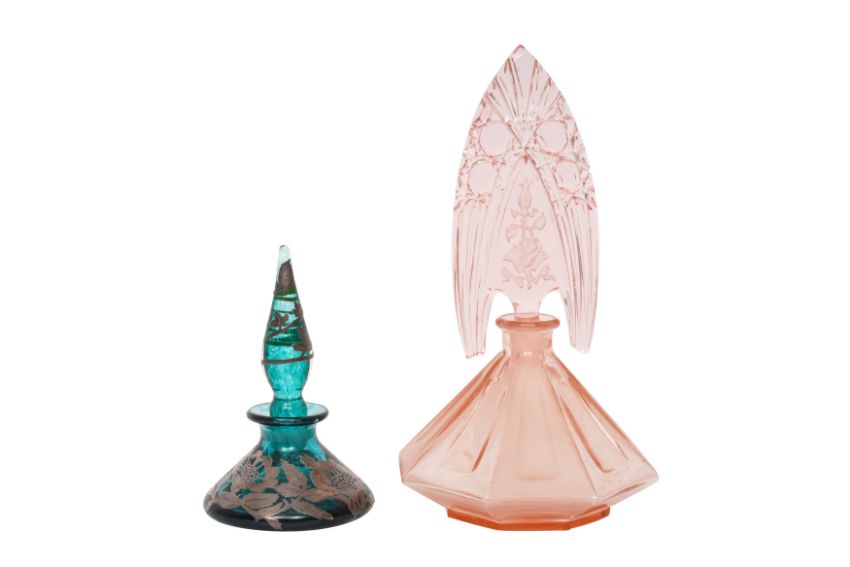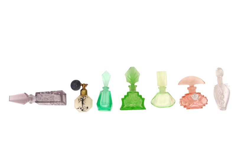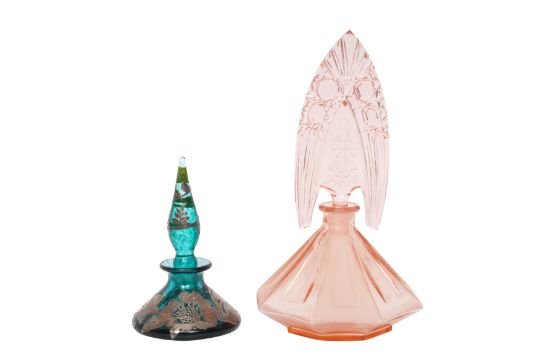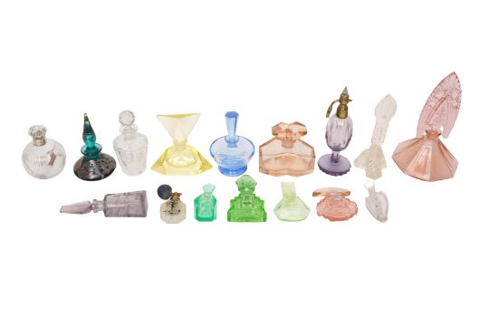 A MIXED GROUP OF ART DECO AND OTHER SCENT BOTTLES, to include Bohemian examples, to include a hallmarked green glass silver overlay example,and a group of facited Bohemian glass scent bottles (16)