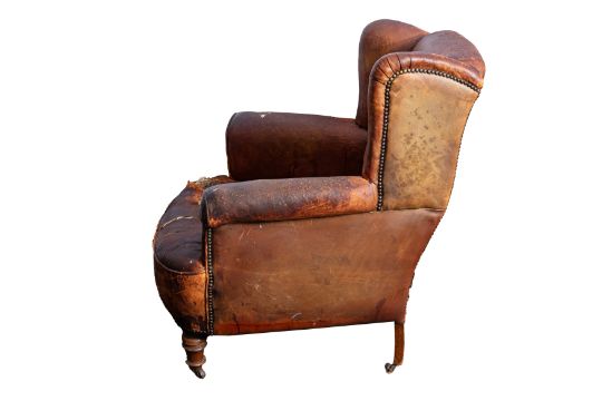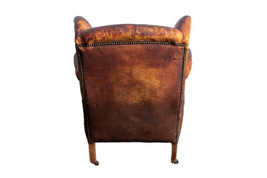 A GEORGIAN WING ARMCHAIR, tan leather upholstered, with sprung, hessian and horse hair filling, over a mahogany frame, raised on turn mahogany feet, terminating at brass castors.