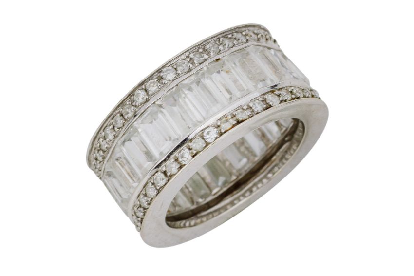 A DIAMOND AND CUBIC ZIRCONIA RING, Centrally set with a row of baguette-cut cubic zirconia, flanked by two rows of round brilliant-cut diamonds, to a 10.1mm wide polished band, maker's mark, stamped 14K, size L, weight 9.0 grams