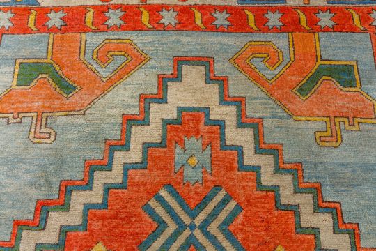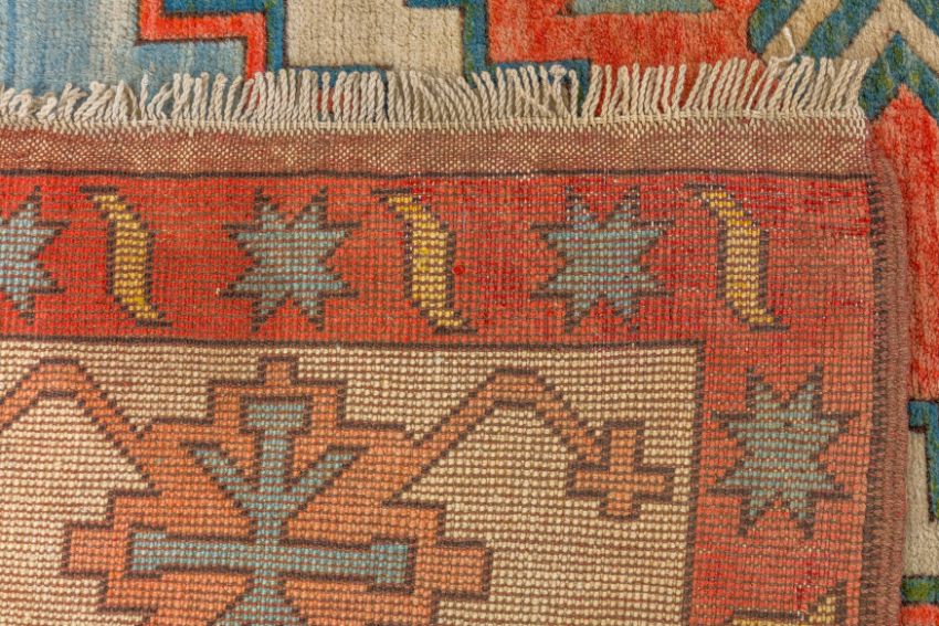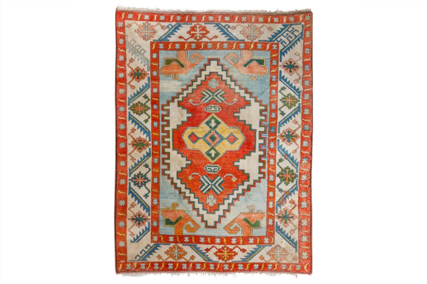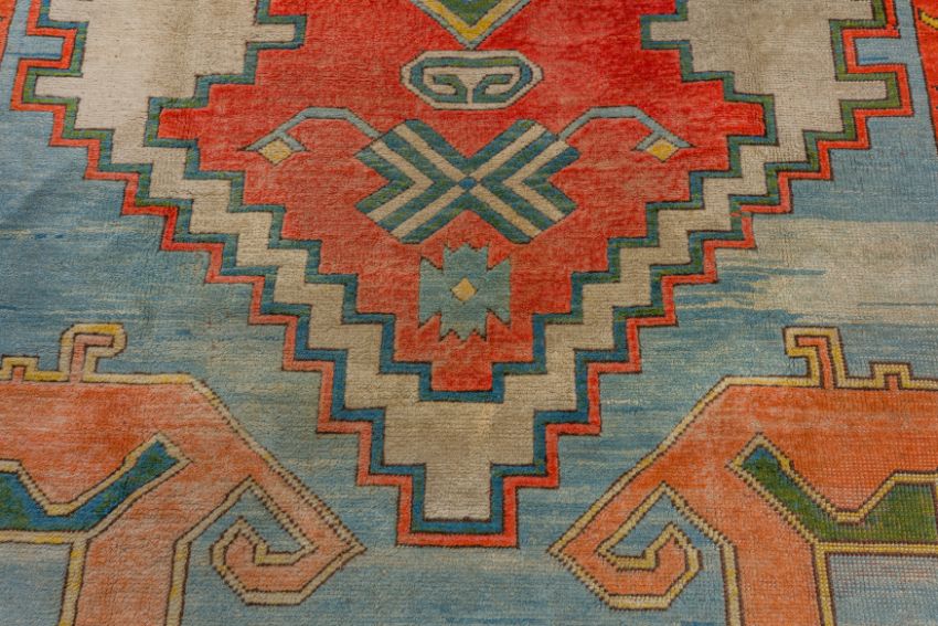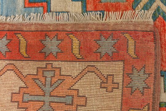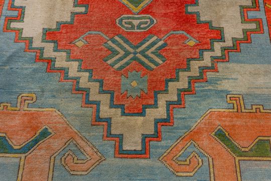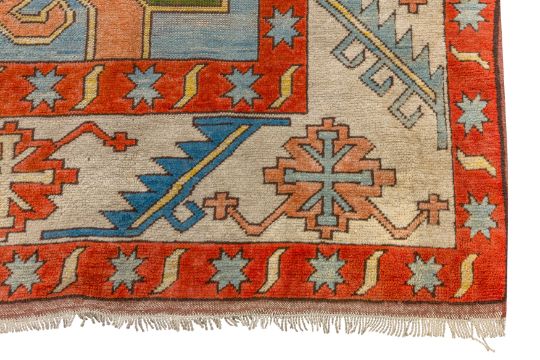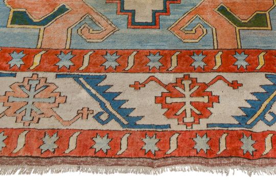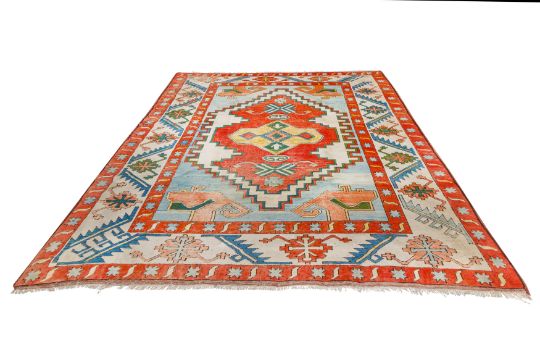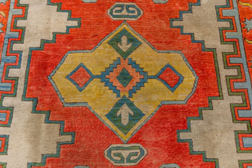 Approx: 340cm. x 244cm. Bold design with veery well balanced colours. This carpet has localized dot like wear at one end of medallion also localized wear at one side of the border and very light weat to the tope pile at one end. Otherwise good pile, soft wool quality. Selvages original. Ends with originalk kilim and fringes, secured. In general, thia carpet is in fair usable conditon.