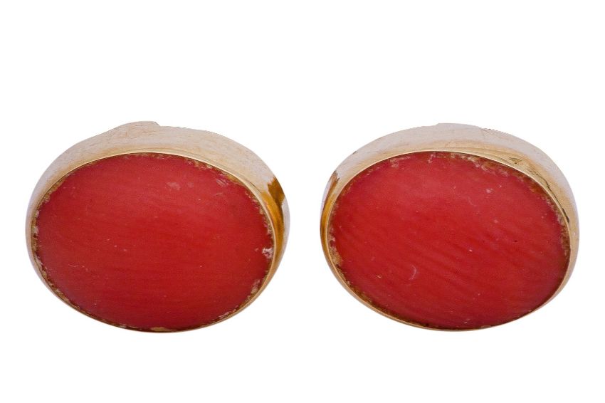 A PAIR OF CORAL STUD EARRINGS, The oval-shaped cabochon coral, to a rub-over setting of polish finish, stamped 750, length 0.8cm, weight 2.1 grams