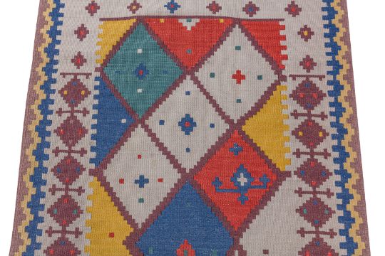 Approx: 308cm. x 84cm. The field with multicolourf floral lattice between stepped lozenge bordr and zig-zag stripes. This kilim runner is in veey good usable conition. Ends and selvages original. Attractive piece.