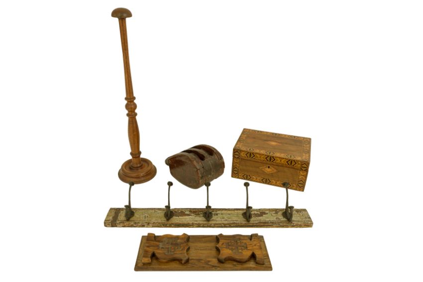 A GROUP OF FIVE ASSORTED ITEMS, comprising a vintage turned wooden wig stand, with a round base and tapered stem, a carved wooden book rest marked “Jerusalem,” featuring intricately shaped supports and cross motifs; a rustic block and tackle; a distressed wooden coat hook board fitted with five sturdy metal hooks mounted on a weathered wooden backing, an inlaid wooden box, adorned with geometric patterns and a central diamond-shaped motif. (5)