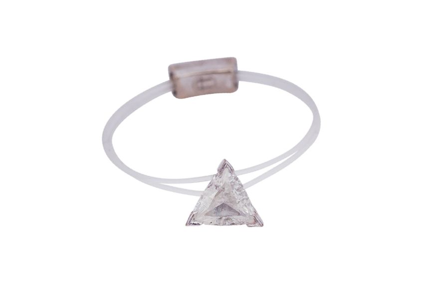 A DIAMOND SINGLE-STONE RING, Set with a trillion-cut diamond 0.40ct approximately, to a double translucent nylon band, to a round brillaint-cut diamond set at the back, maker's mark, unstamped, size O, weight 0.8 grams
