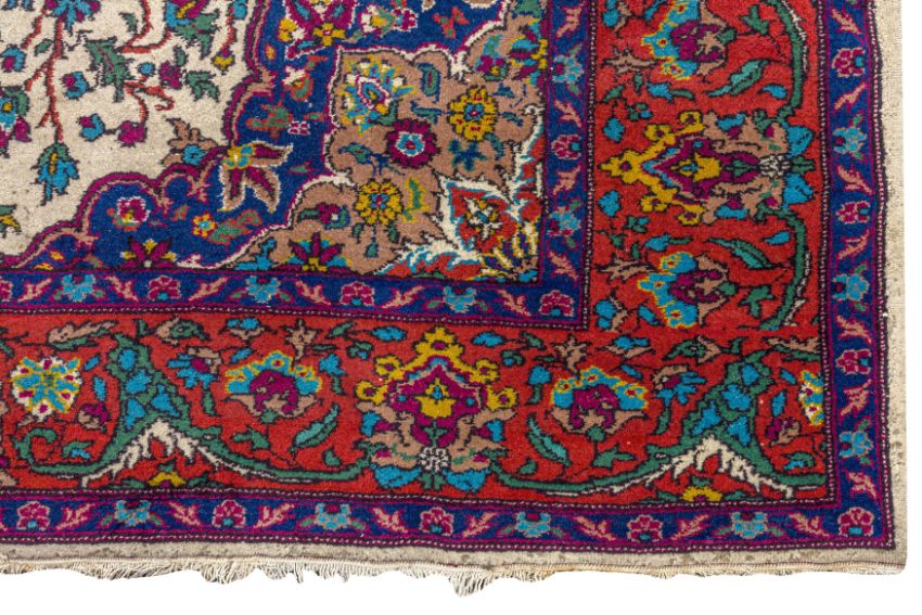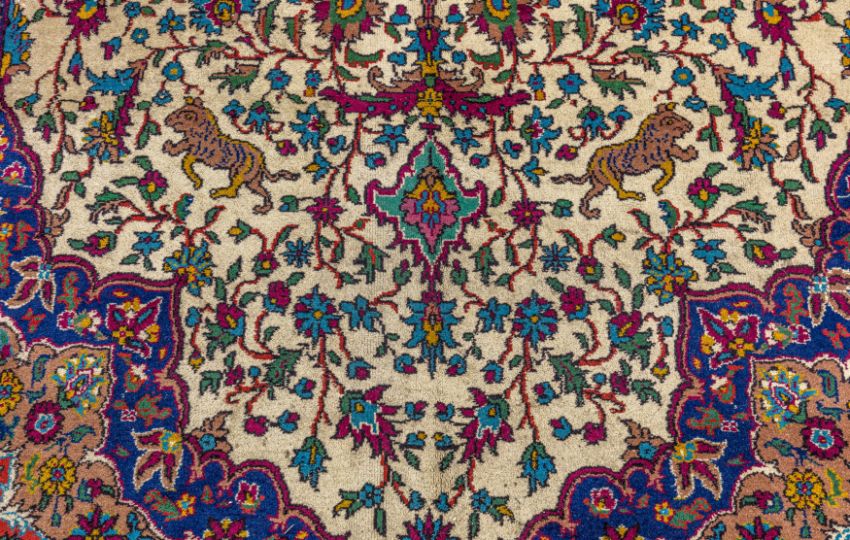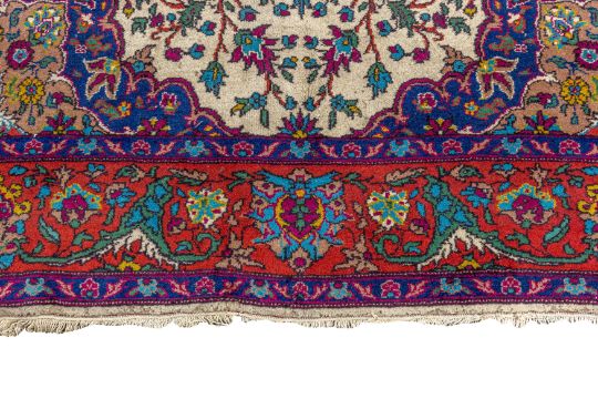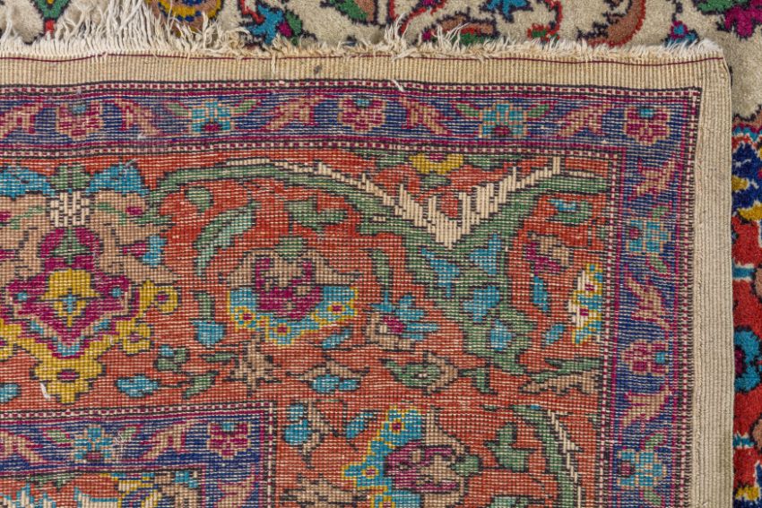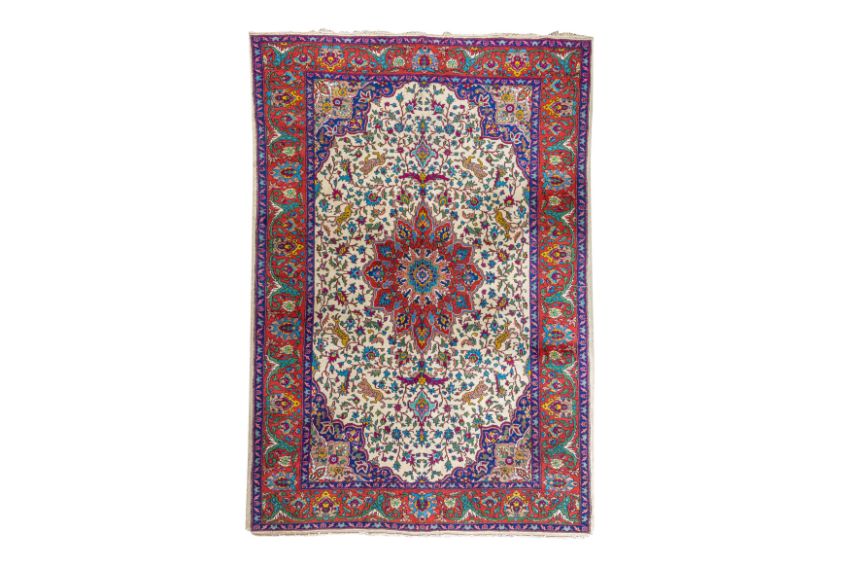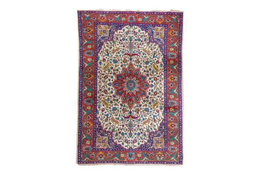 Approx: 305cm. x 194cm. Very well drawn design with delicate floral and leafy tendrils together with various animals around central double floral medallion. In palmette and arabesque border between floral stripes. Colours are well balanced wih soft ivory field. Apart of tiny wear at one side edge and very small loss in two corners, This carpet has good pile, soft wool quality. Ends with original kilim. Fringes slighty fraying. Selvages original. In general, this carpet is in good usable condition. Very good furnishing piece.