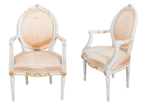 A PAIR OF 19TH CENTURY FRENCH PAINTED AND PARCEL GILT FAUTEUIL ARMCHAIRS, the frames with carved swag and tail decoration, silk upholstered back, arm rests and overstuffed seats, raised on carved and fluted legs.