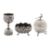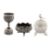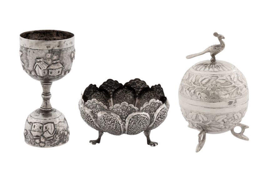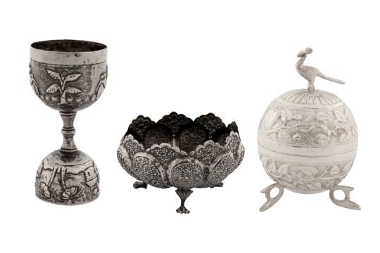 Raj period. Comprising a Calcutta jigger or spirit measure in village pattern, a Lucknow lobed bowl in coriander pattern, and a Lucknow ovoid box, with peacock finial. (3)
