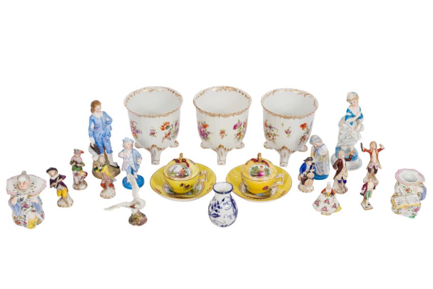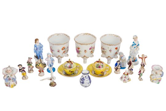 A GROUP OF ASSORTED CONTINENTAL PORCELAIN to include Dresden Franziska Hirsch cache pots, a pair of Dresden 19th century porcelain chocolate cups and covers and a group of assorted figures.