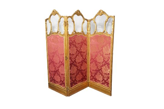 A NAPOLEON III GILTWOOD THREE FOLD SCREEN, with Rococo style scrolling acanthus leaves, each section with three bevelled glass panels, over pink damask panel.