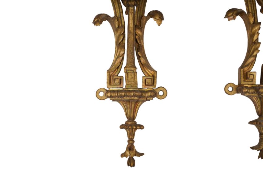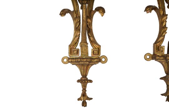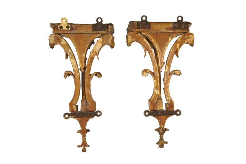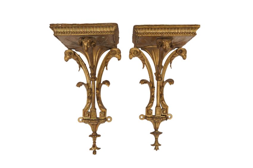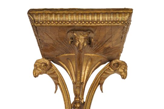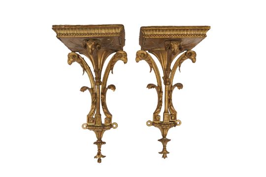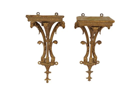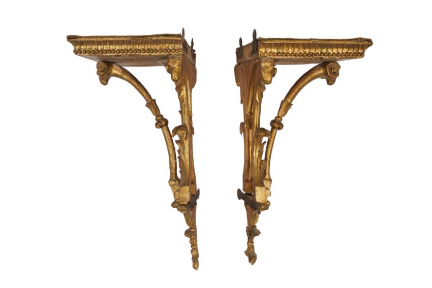 A PAIR OF GEORGE III GILTWOOD WALL BRACKETS, CIRCA 1800, with carved acanthus scrolls and ram's head motifs, each with rectangular tops and original mounts for wall display. (2)