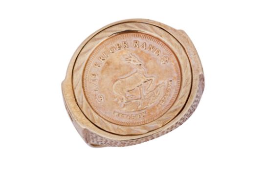 A KRUGERRAND-REPLICA COIN RING, The 9ct yellow gold ring, centrally set with one-tenth Krugerrand one-sided replica coin, surrounded by a textured decoration, to tapered pierced shoulders, maker's mark, UK hallmark, size N, weight 3.6 grams