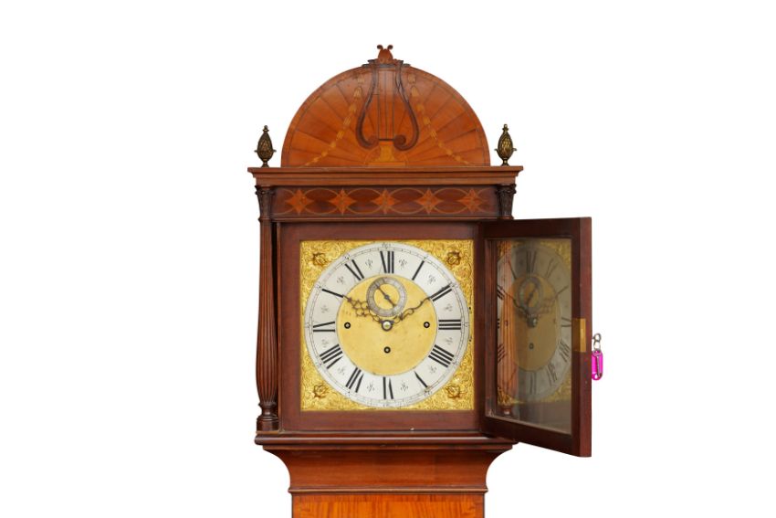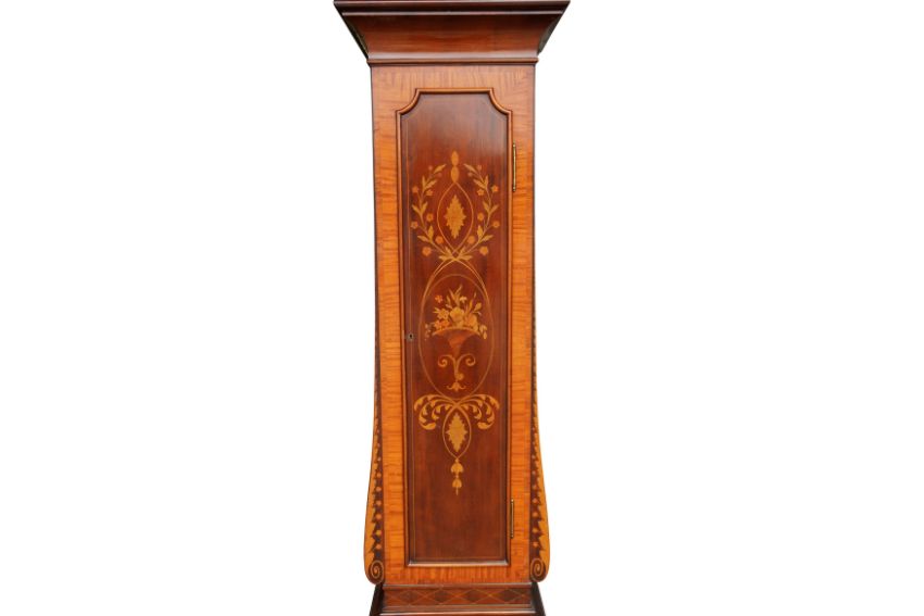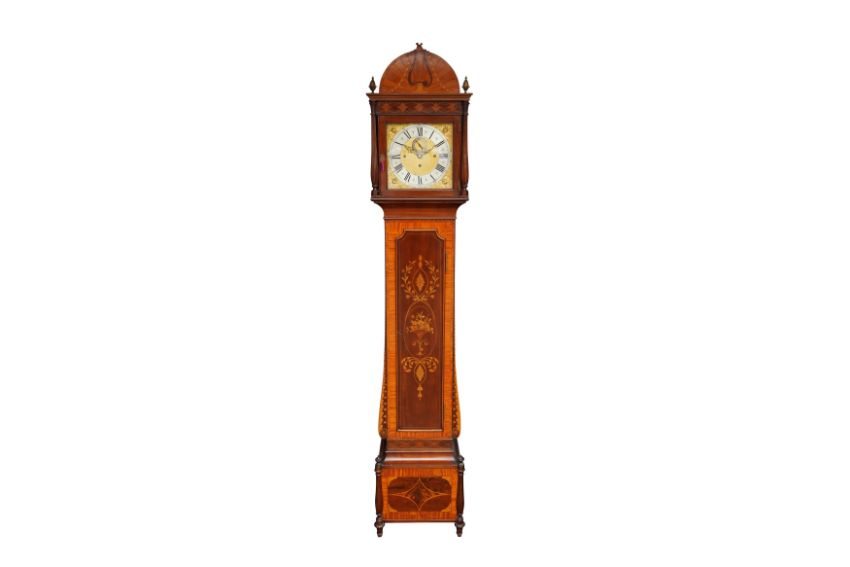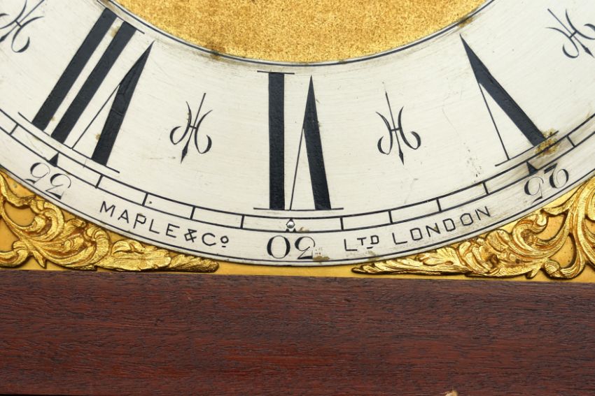 AN EDWARDIAN 'MAPLE AND CO' LONG CASE CLOCK, with marquetry inlaid case and gilt dial with applied Roman chapter ring and sub-seconds dial.