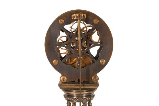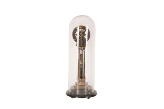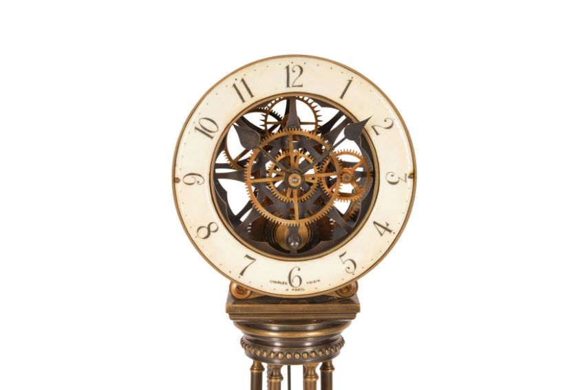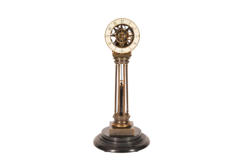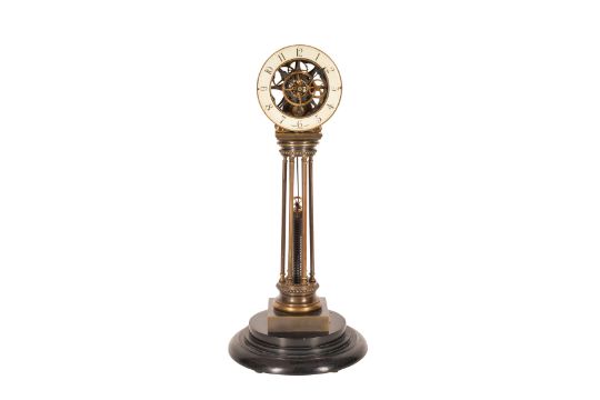 AFTER CHARLES VOISIN; A PILLAR SKELETON CLOCK, 20TH/21ST CENTURY, the enamelled chapter ring with Arabic numerals marked 'Charles Voisin, A Paris', the fusee movement mounted on six brass columns, powered by a coil spring, on a step-down circular Belgian slate base, under a glass dome.