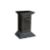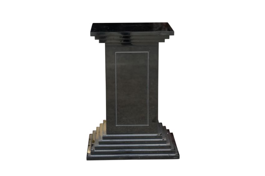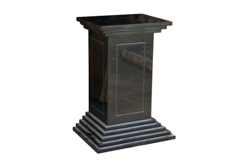 A BLACK LACQUERED PEDESTAL, MID 20TH CENTURY, of stepped architectural design, featuring a rectangular top above a tiered plinth base, with inset panel detailing on all sides, on wheels.