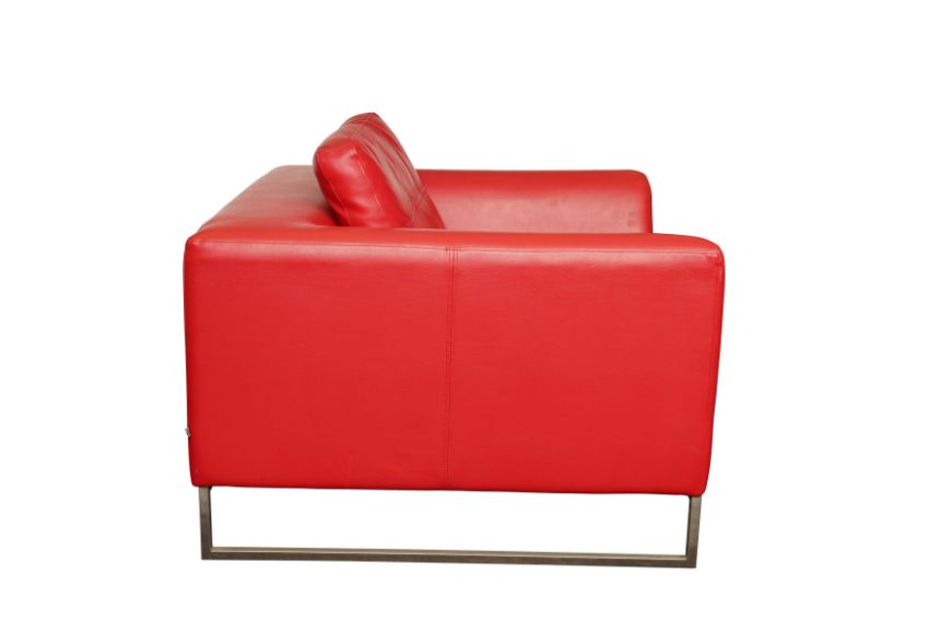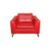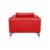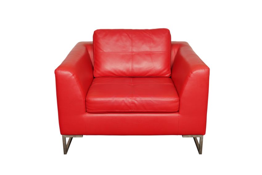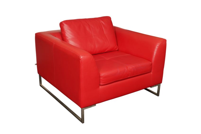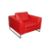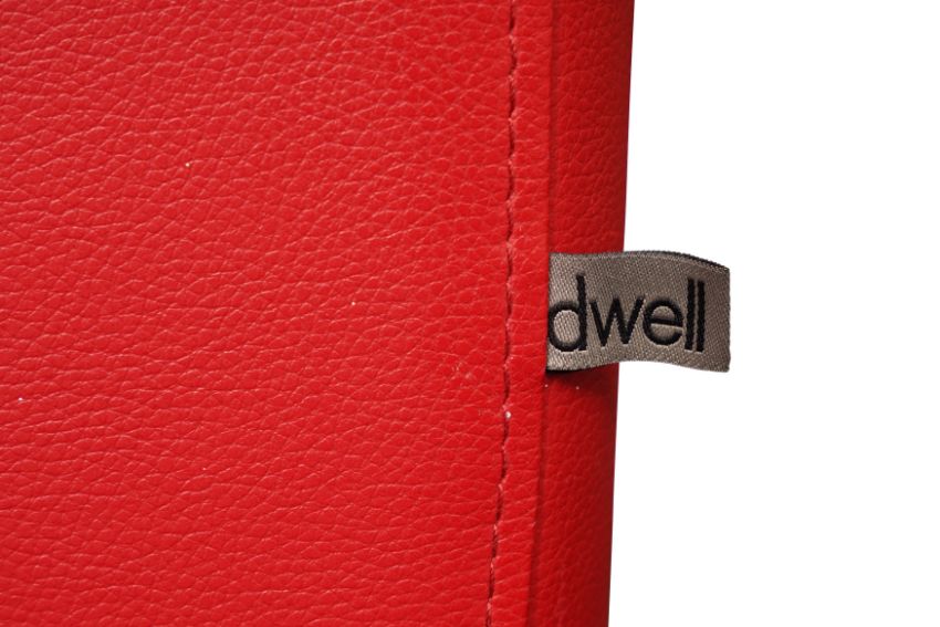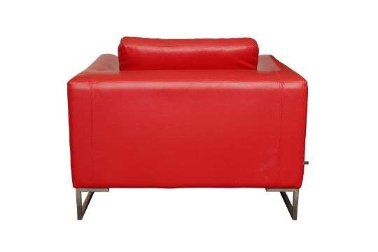 A CONTEMPORARY RED LEATHER ARMCHAIR BY DWELL, featuring a minimalist design and boxy silhouette, supported by modern metal legs and including a cushioned seat and backrest.