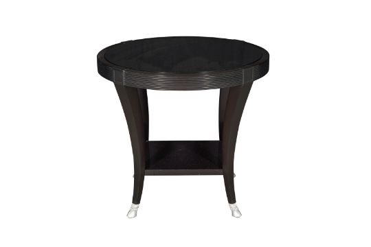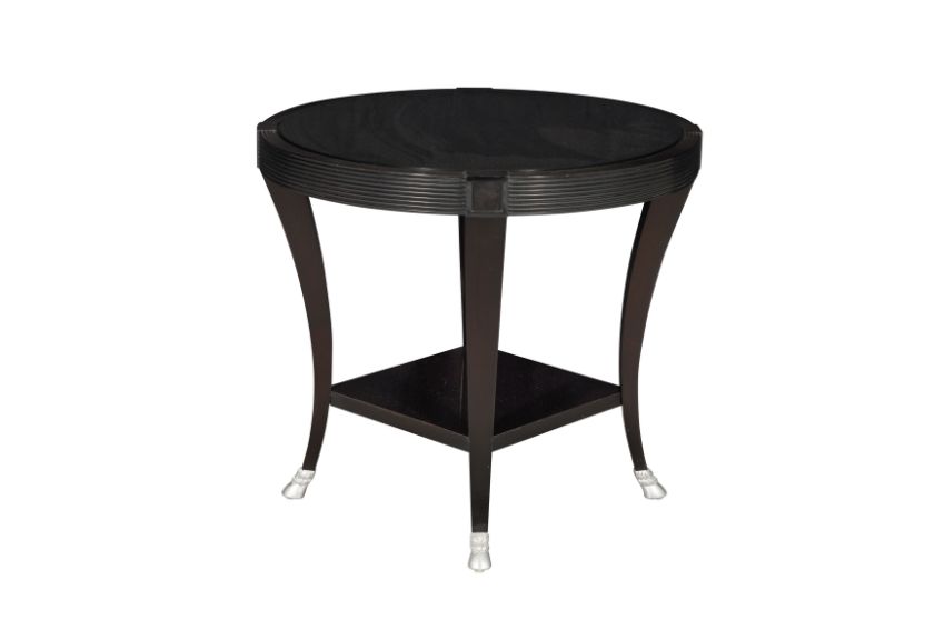 A JOHN HUTTON SIDE TABLE, LATE 20TH CENTURY, featuring a circular black top with a ribbed edge, supported on four splayed legs with a square lower shelf, terminating in silver hoof feet.