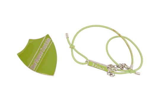 Christian Dior Green Badge Brooch and Choker Set, 'Dior House Captain' brooch, enamel, silver tone, 2000's (Qty 2)