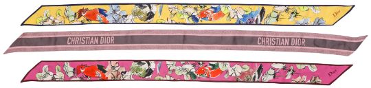 Christian Dior Silk Mitzah Scaves, pink 'Toile de Jouy Sauvage', yellow 'Diorelita' and fuchsia 'Diorelita' designs (Qty 3)