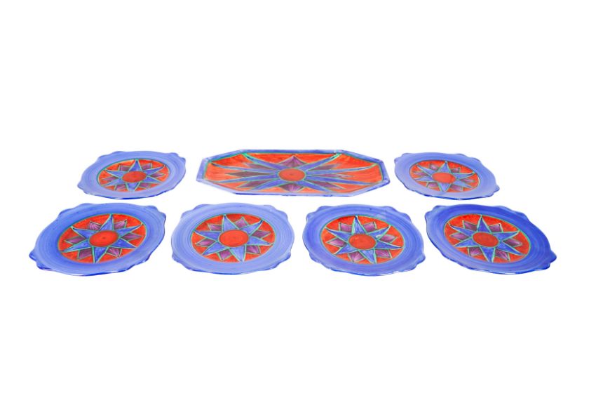 Six 'Bizarre' Leda shape side plates and a shape 334 sandwich plate in blue and red geometric design, circa 1929