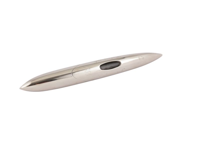 The design is asymmetric, the center of gravity has been lowered to give the pen a tumbler effect so that it won’t roll.