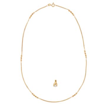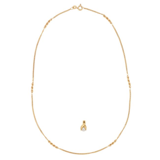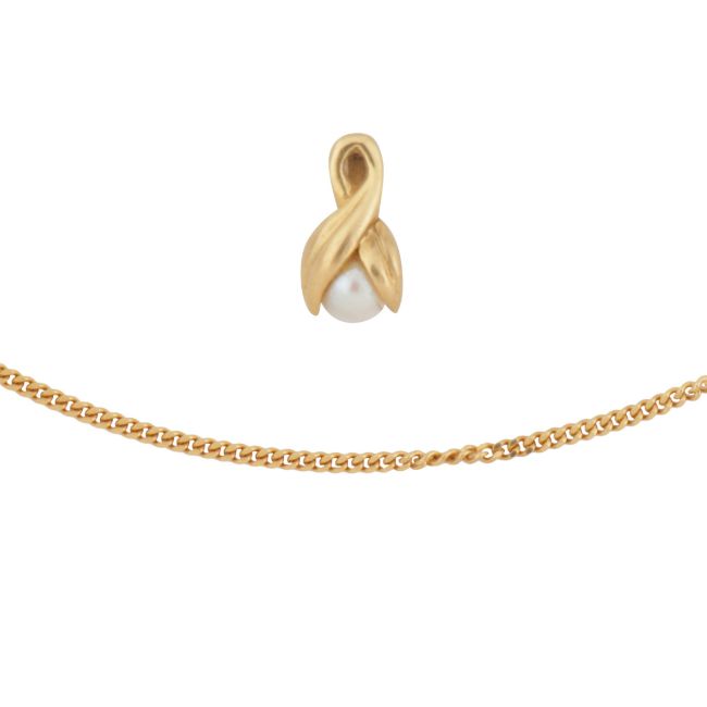 The curb and wheat-link chain necklace with a pearl pendant of leaves design, mounted in yellow metal, the chain set in 14ct gold with maker's mark and Italian assay mark, the pendant stamped 750 with maker's mark, lengths: necklace 41.5cm, pendant 1.2cm, weight 5.3grs