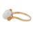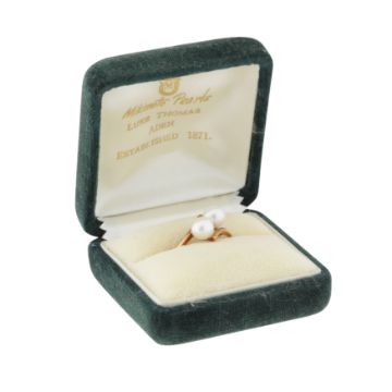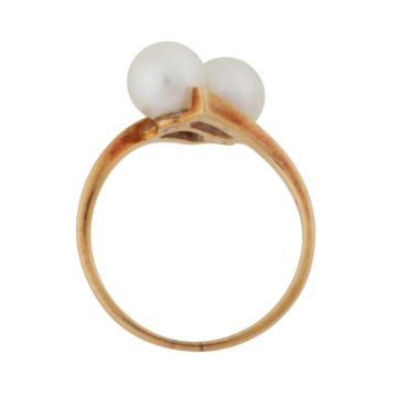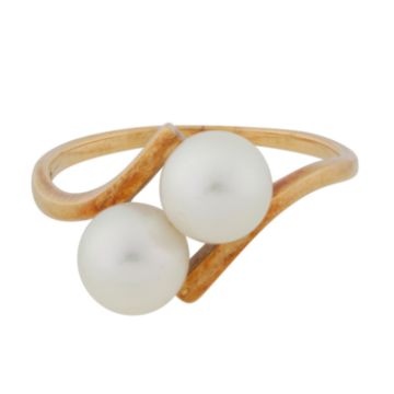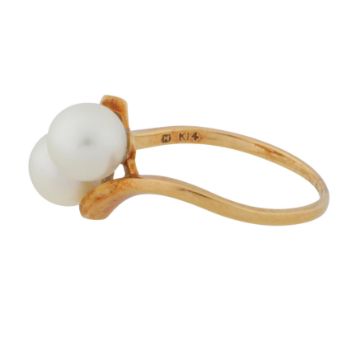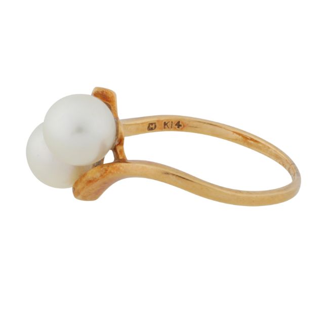 Set with two 6.6mm pearls of white tint and medium to high lustre, to a cross-over straight polished mount, set in yellow metal, signed, stamped K14, size O, weight 2.8grs, with a green velvet maker's case