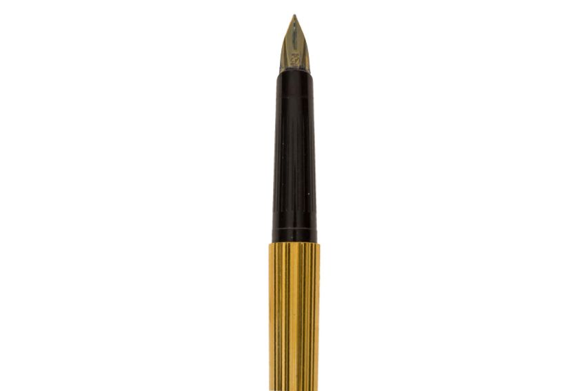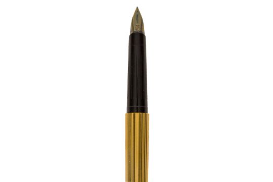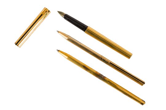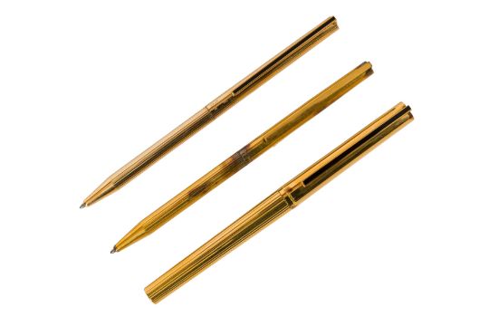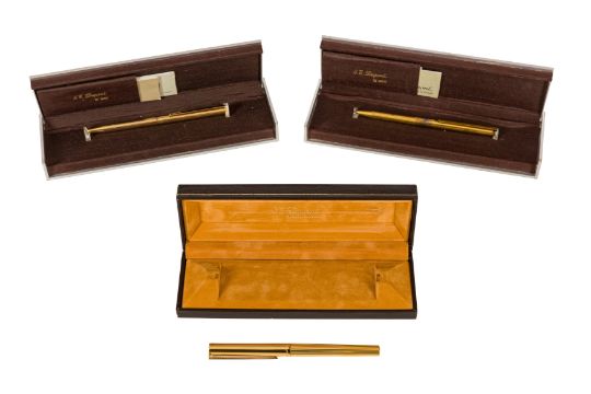To include a silver gilt metal fountain pen, 18ct nib, stamped 750, band to the cap stamped 'ST Dupont de Paris 925', serial no J5DB22', in original branded box; a gilt metal twist action ball point pen, stamped 'ST Dupont Paris', serial no 43EBB29; and a silver gilt twist-action ballpoint pen, stamped 'ST Dupont de Paris 925', serial no B6CF96 (3)