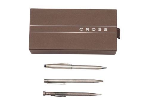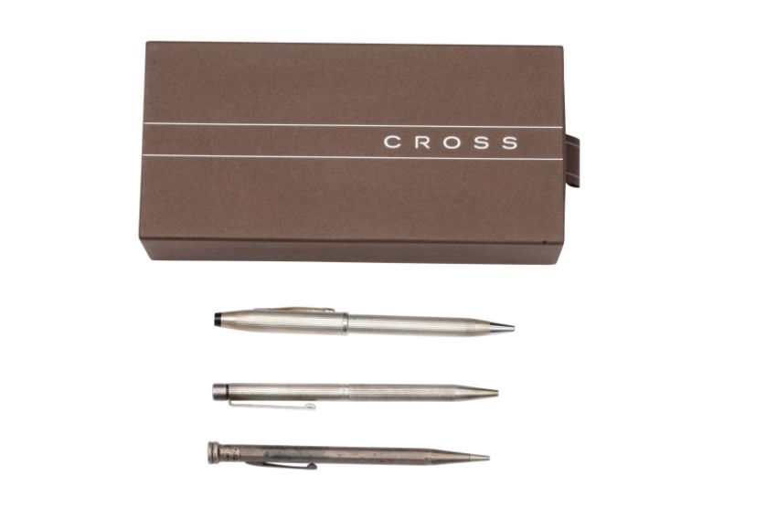 To include a Cross silver ballpoint pen, stamped '925 silver', a Sheaffer silver ballpoint pen, stamped 'Sheaffer USA Sterling Silver'; and a Life Long sterling silver mechanical pencil, stamped 'Sterling Silver' (3)