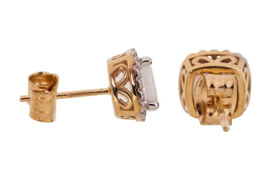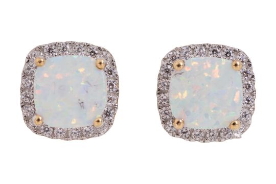 Each set with a cushion-shaped opal cabochon, within a circular-cut cubic zirconia surround, post fittings, mounted in 9 carat gold, European convention mark, stamped 9KT, length 1.7cm, weight 1.8grs