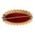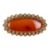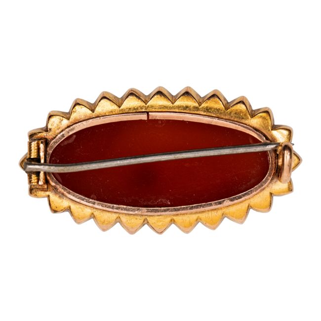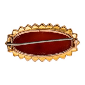 Of oval design, centrally set with a carnelian slab, surrounded by a row of seed pearls, mounted in yellow metal (white metal pin), unmarked and untested, length 3.8cm, weight 7.7grs