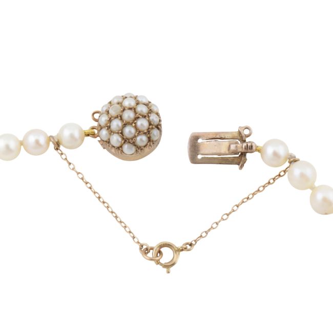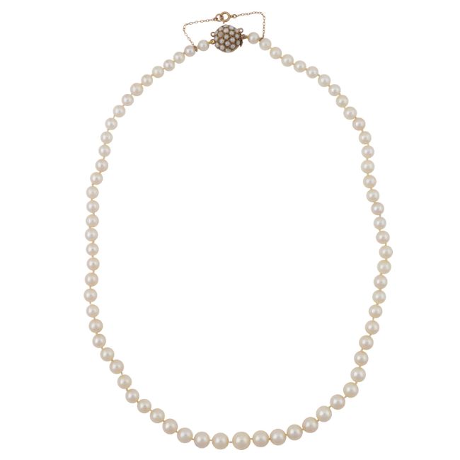 Set with 5.1-8.3mm graduated round and near-round pearls of white tint with yellow and gray overtones, to a pearl-set circular box clasp and safety chain, mounted in yellow metal, stamped 9Ct, length 52.0cm, total gross weight 29.6grs