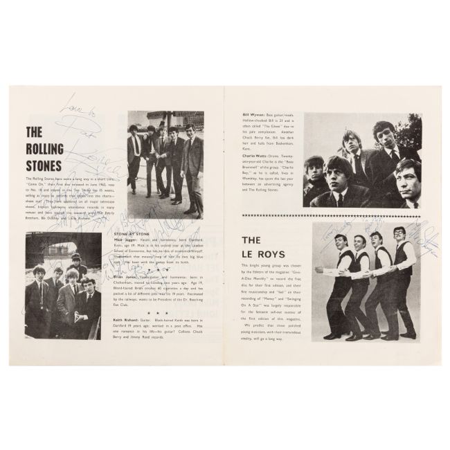 'All Stars '64' vintage souvenir programme, signed on an internal page featuring their photographs by Keith Richards, Bill Wyman, Charlie Watts, Brian Jones and Mick Jagger, also signed on other pages by John Leyton, Jet Harris, Mike Sarne, Billie Davis, The Le Roys and The Swinging Blue Jeans, original wrappers, some creasing and handling wear, 4to.