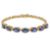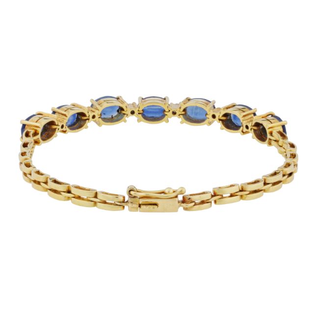 Claw-set to the front with a row of seven oval-cut blue sapphires interspersed with circular-cut white sapphires, to a fancy-link articulated chain, push box clasp and safety catch, partially erased 750 stamp, length 17.2cm, gross weight 14.4grs