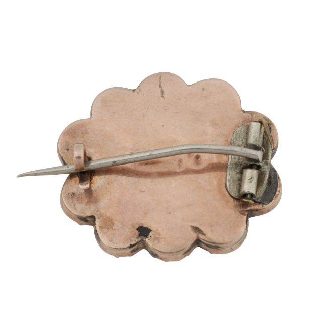 Featuring ten circular-cut flat garnets, surrounding a central locket with woven hair, mounted in yellow metal, unmarked, length 2.3cm, weight 4.3grs