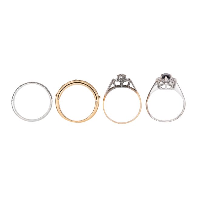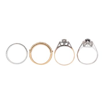 To include a sapphire and diamond halo ring (one stone deficient), a diamond flowerhead ring, a diamond half eternity band with a swivelling hidden band engraved 'I love you', and a diamond half eternity band, all set in yellow or white 9ct gold with UK hallmark, sizes varying between L and N, total gross weight 8.0grs (4)